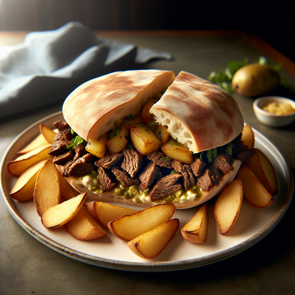**Brief Description: ** This Mexican-inspired dish features a flavorful beef and potato filling stuffed inside a crusty bread roll, creating a hearty and delicious main course.