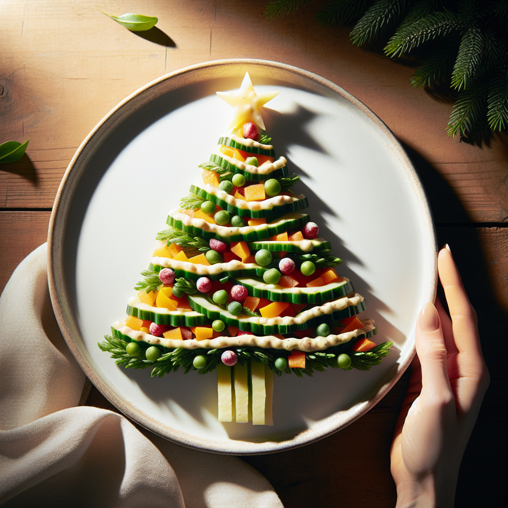 **Brief Description: ** This Christmas tree salad is a fun and festive dish that will impress your guests. It's a cold salad featuring a variety of colorful vegetables arranged in the shape of a Christmas tree, perfect for holiday gatherings.
