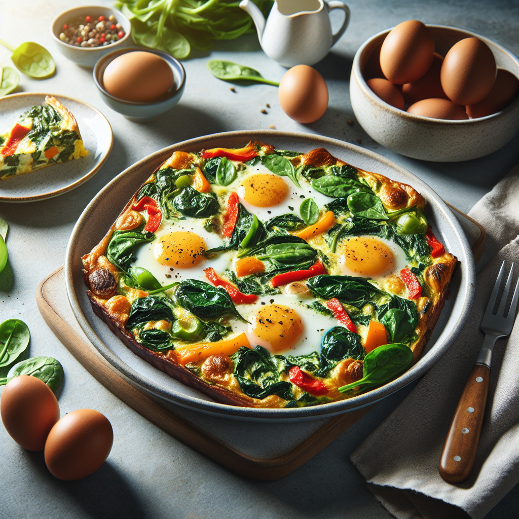 **Description: ** This delicious and wholesome veggie-packed egg bake is perfect for a hearty breakfast or brunch. Packed with spinach, bell peppers, and onions, it's a great way to start your day with a nutritious meal.