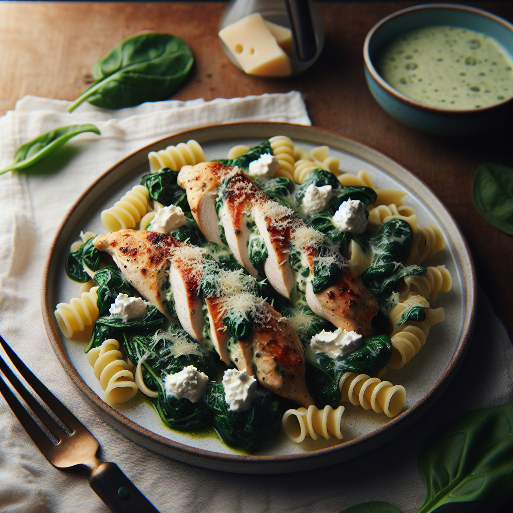 Brief Description: Tender chicken tenders stuffed with a creamy spinach and ricotta mixture served with pasta, creating a flavorful and satisfying meal.