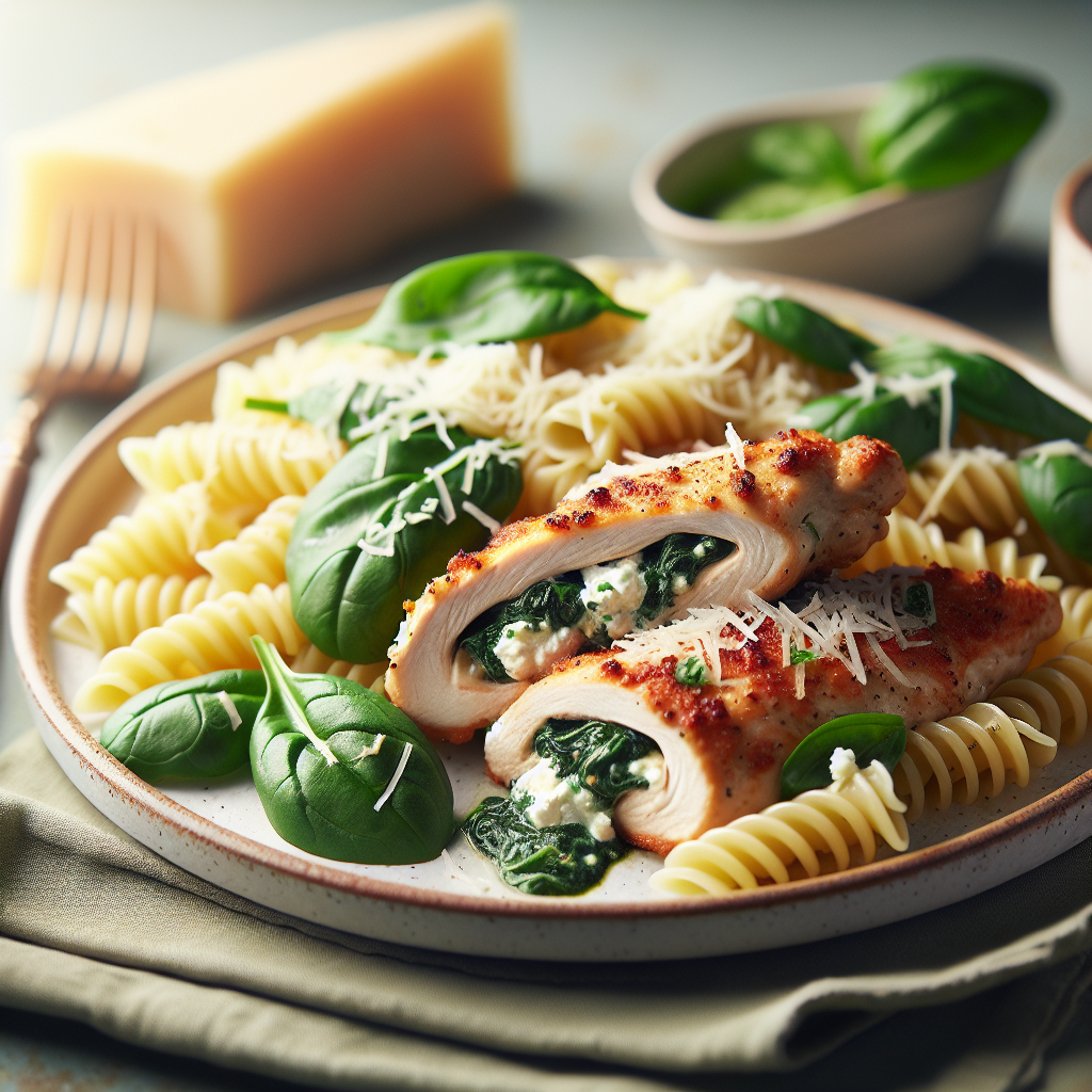 Brief Description: This recipe combines juicy chicken tenders stuffed with a flavorful spinach and ricotta mixture, served alongside pasta for a wholesome and satisfying meal.
