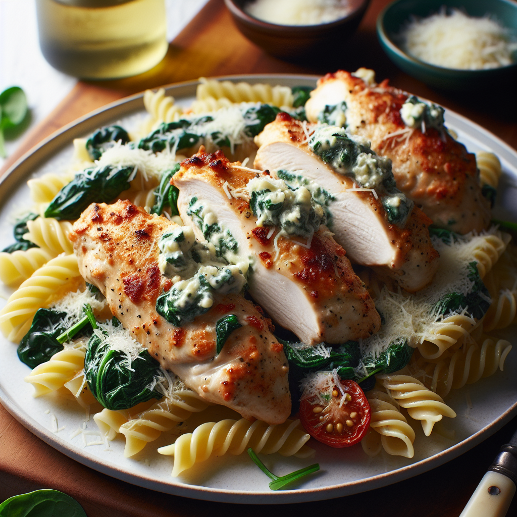 Brief Description: Juicy chicken tenders stuffed with a creamy spinach and ricotta mixture, served with pasta for a comforting and delicious meal.
