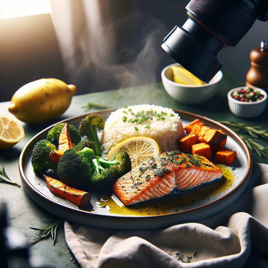 Recipe Title: Baked Lemon Herb Salmon with Roasted Broccoli, Sweet Potato, and Rice