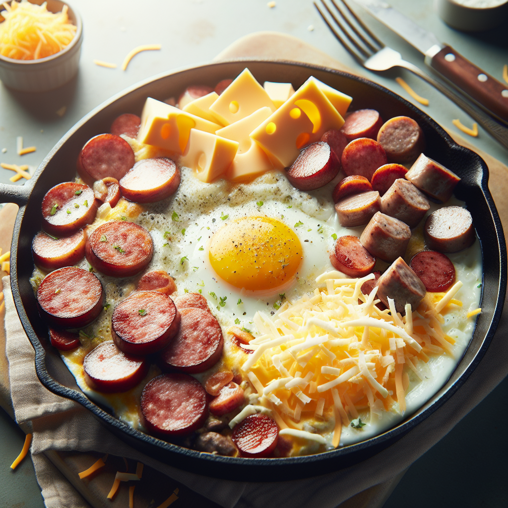 Brief Description: A gluten-free, low-carb, and high-protein breakfast skillet loaded with eggs, sausage, cheese, and a burst of sweetness from blueberries and bananas.