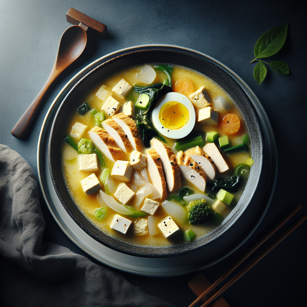 Brief Description: This hearty and flavorful soup combines tender chicken, tofu, and a variety of vegetables in a fragrant and comforting broth infused with Asian spices.