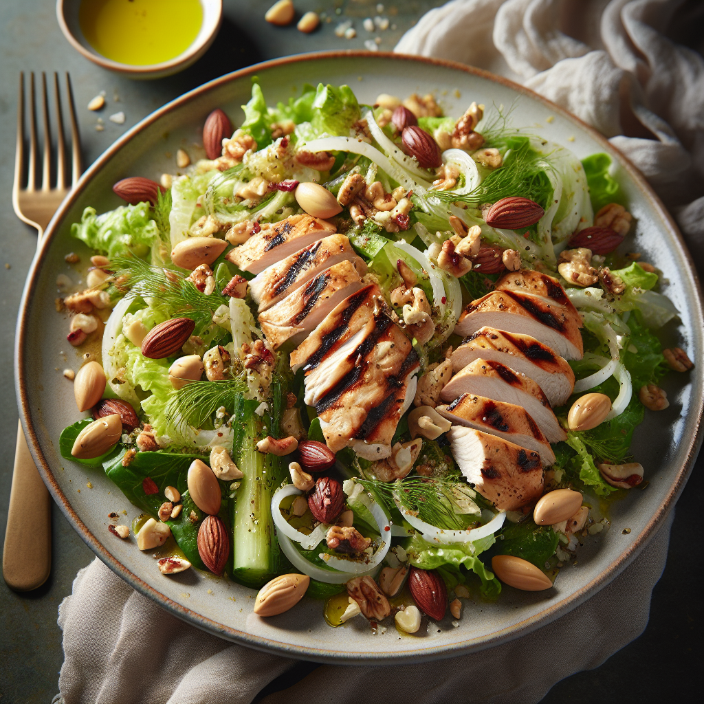 Recipe Title: Mediterranean Grilled Chicken Salad with Fennel and Nut Vinaigrette