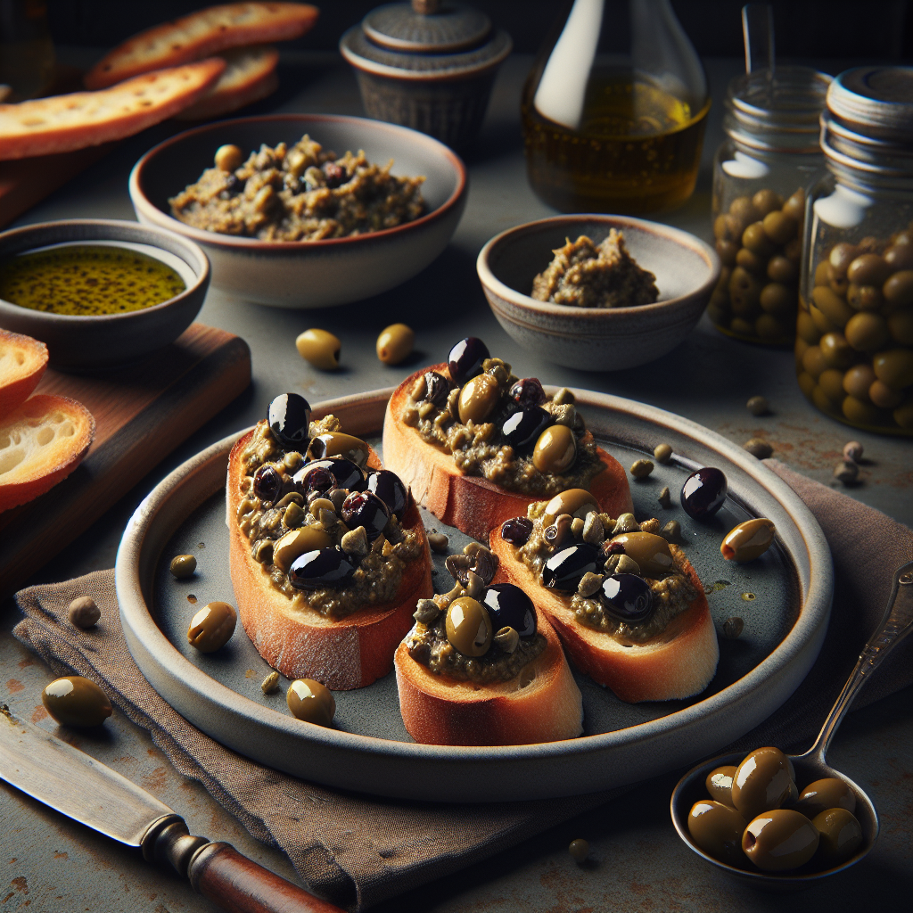 Brief Description: A flavorful and tangy Italian tapenade made with olives, capers, and herbs, served on crispy crostini. Perfect for entertaining or as an appetizer for a dinner party.