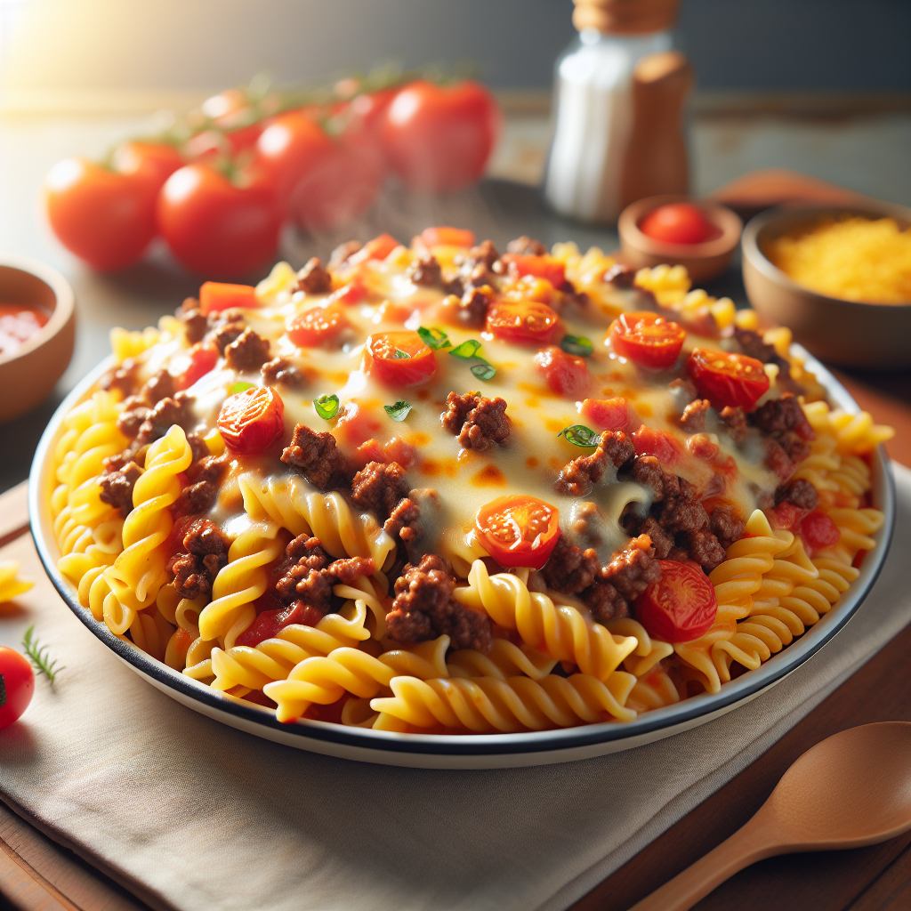 Brief Description: This hearty and flavorful dish combines tender fusilli pasta with seasoned ground beef, tangy diced tomatoes, and gooey melted cheese.