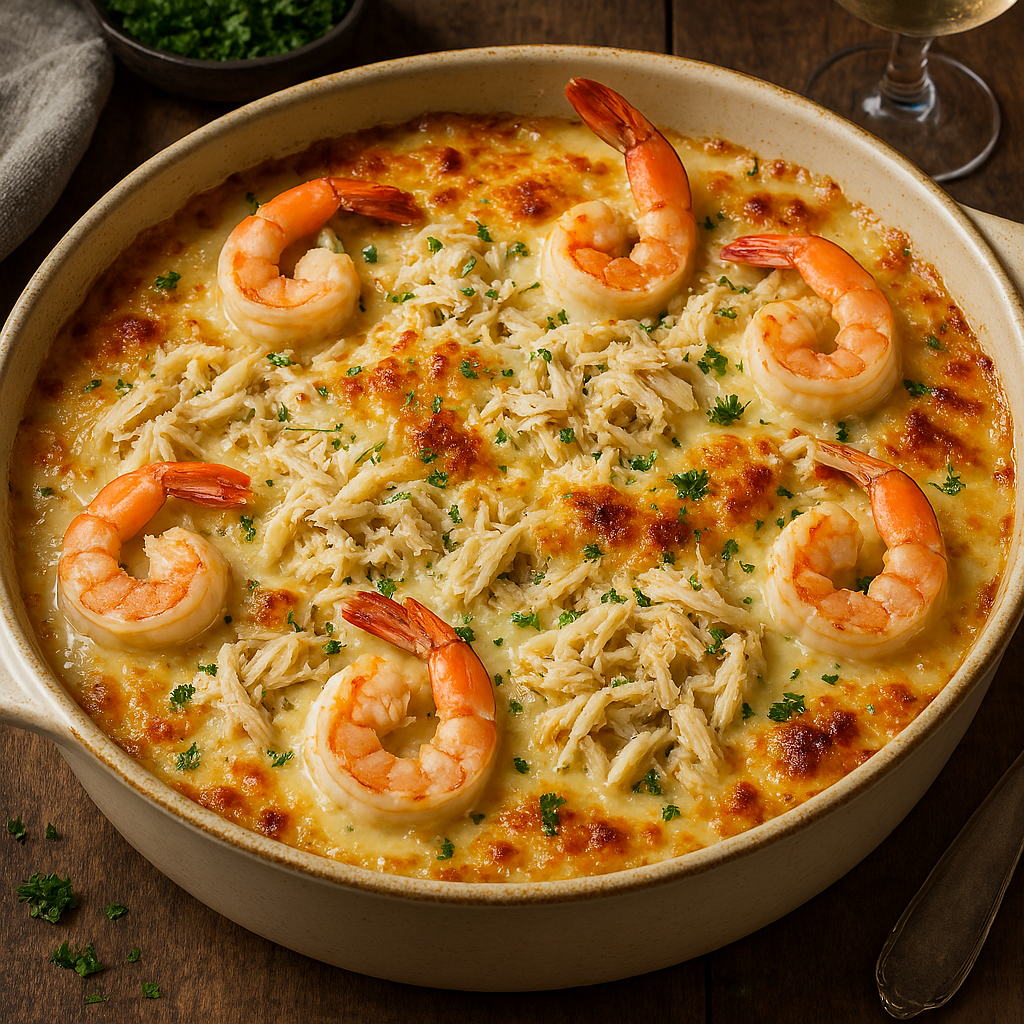 Brief Description: This rich and decadent casserole combines the flavors of the sea with the creaminess of cheese for a luxurious dish that is perfect for special occasions.