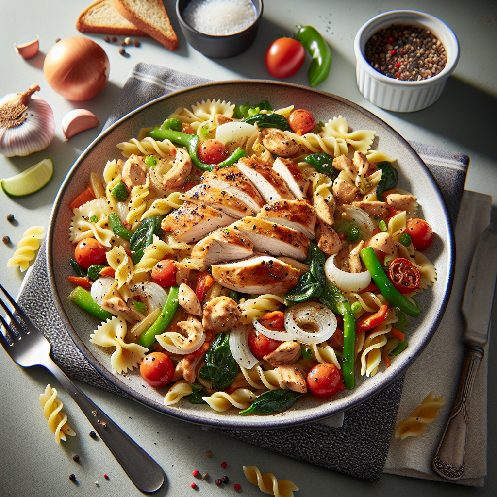 Brief Description: This Italian-inspired dish combines tender chicken, colorful vegetables, and al dente pasta in a flavorful and satisfying low-fat meal.