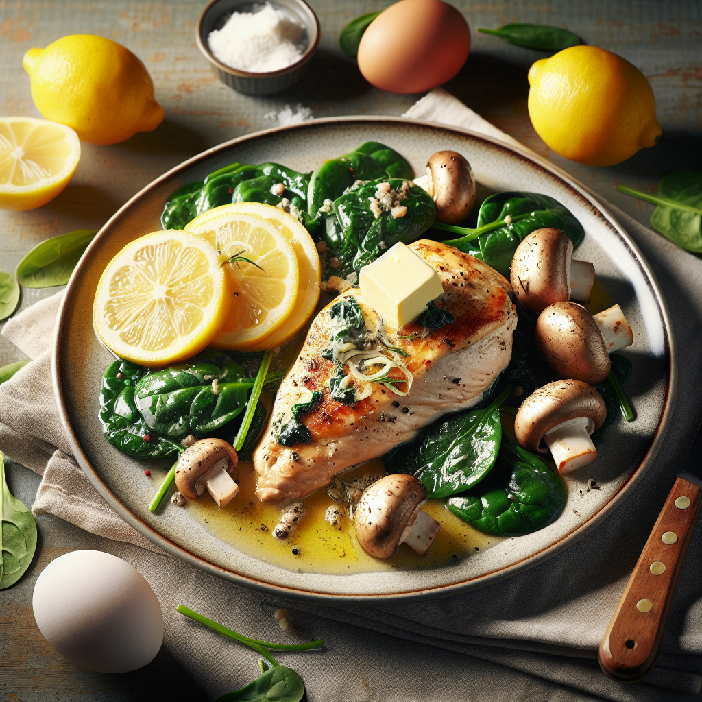 Recipe Title: Lemon Butter Chicken with Spinach and Mushrooms