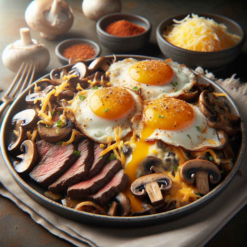 Recipe Title: Beef and Mushroom Skillet with Cheesy Garlic Eggs