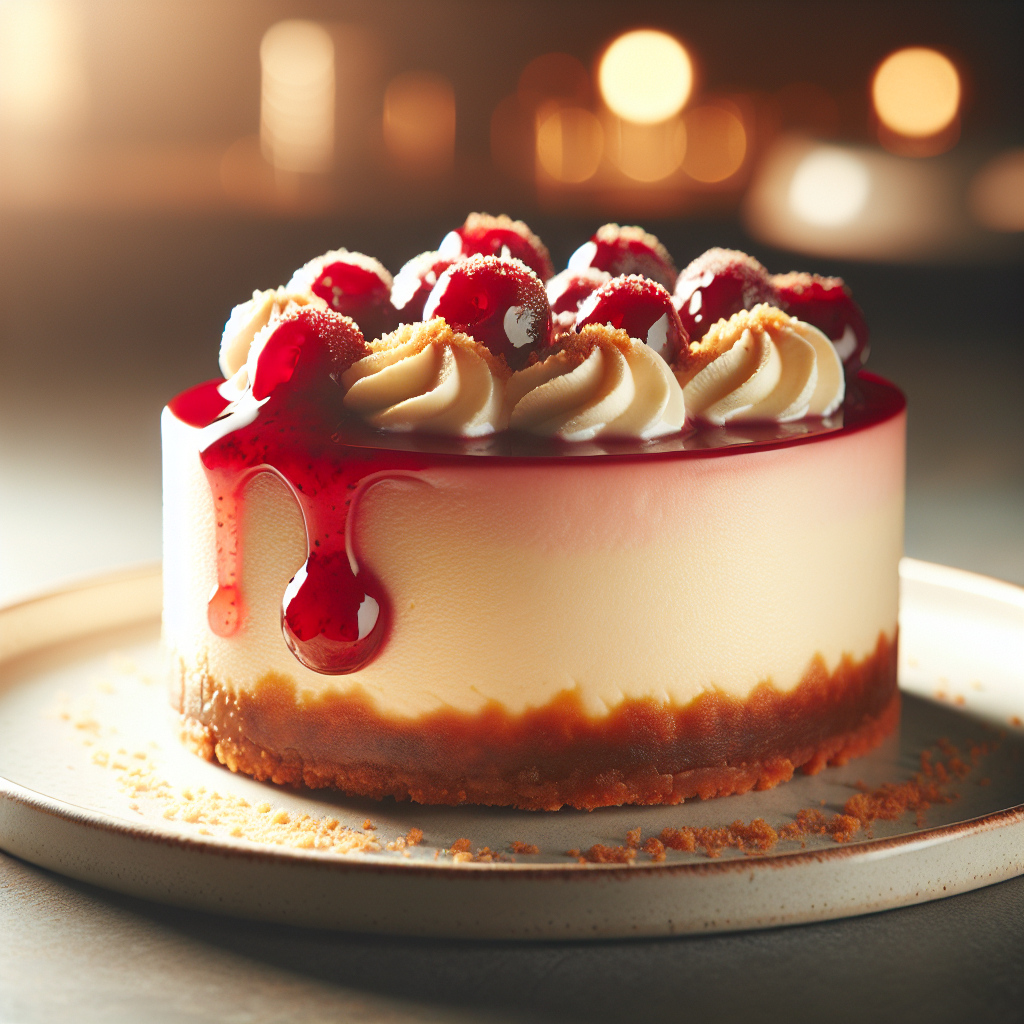 Brief Description: Indulge in a decadent and creamy whipped cheesecake topped with a luscious cherry and raspberry pie filling sauce, all nestled on a buttery graham cracker crust.