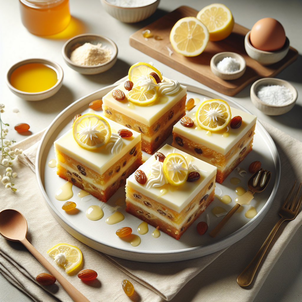 Brief Description: These Lemon Honey Sultana Bars with Coconut Cream Cheese Frosting are a delightful dessert that combines zesty lemon, sweet honey, and creamy coconut flavors. The bars are topped with a luscious coconut cream cheese frosting that adds a rich and tangy twist. Perfect for a sweet treat after dinner or as a special dessert for any occasion.