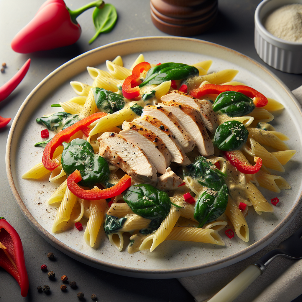 Brief Description: This high-protein pasta dish is a delicious and satisfying dinner option that combines tender chicken, vibrant bell peppers, and nutritious spinach, all brought together in a creamy sauce.