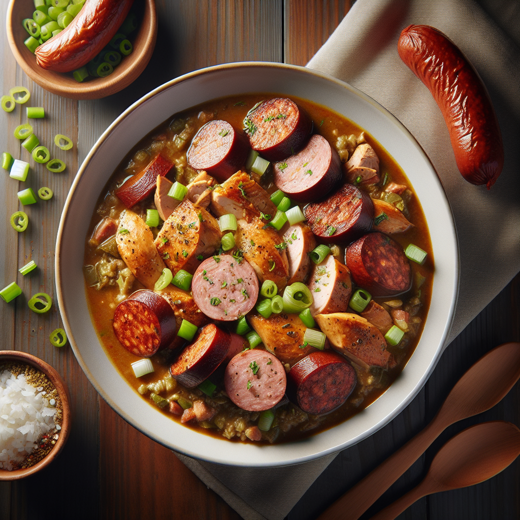Brief Description: A hearty and flavorful Cajun stew featuring tender chicken, smoky sausage, and aromatic vegetables simmered in a rich broth seasoned with Cajun spices.