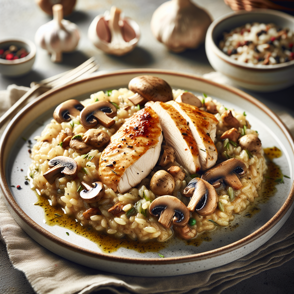 **Brief Description: ** This creamy and flavorful risotto combines tender chicken, earthy mushrooms, and aromatic garlic for a comforting main course.