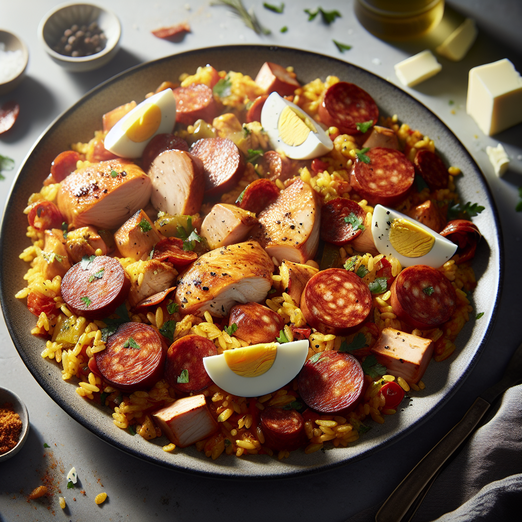 Brief Description: A flavorful and hearty Spanish dish with chicken, chorizo, and a mix of vegetables and spices, cooked in a savory broth and served over fluffy rice.
