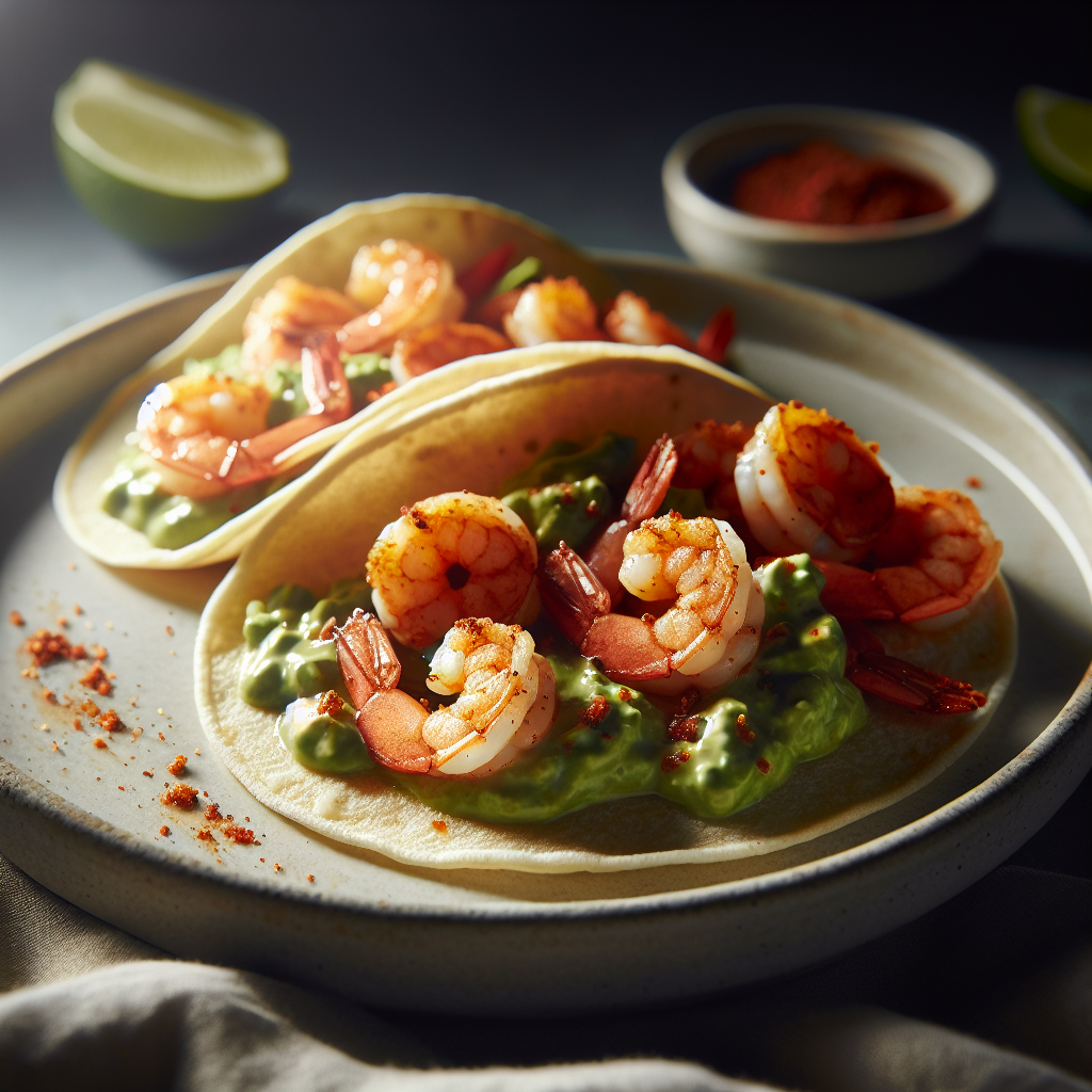 Brief Description: These spicy shrimp tacos are packed with flavor and topped with a creamy avocado sauce. Perfect for a delicious and satisfying meal.