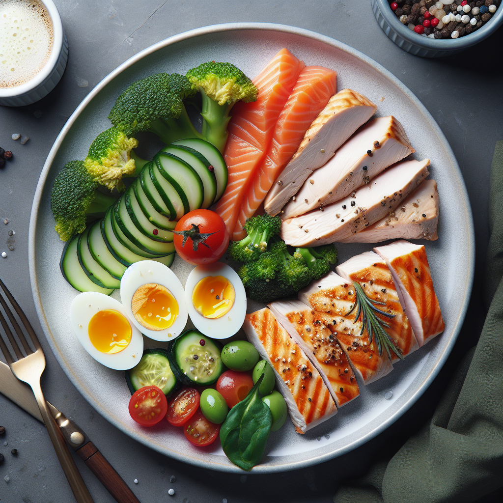 Brief Description: This recipe is a delicious and balanced low-carb American lunch plate featuring chicken, salmon, eggs, and vegetables.