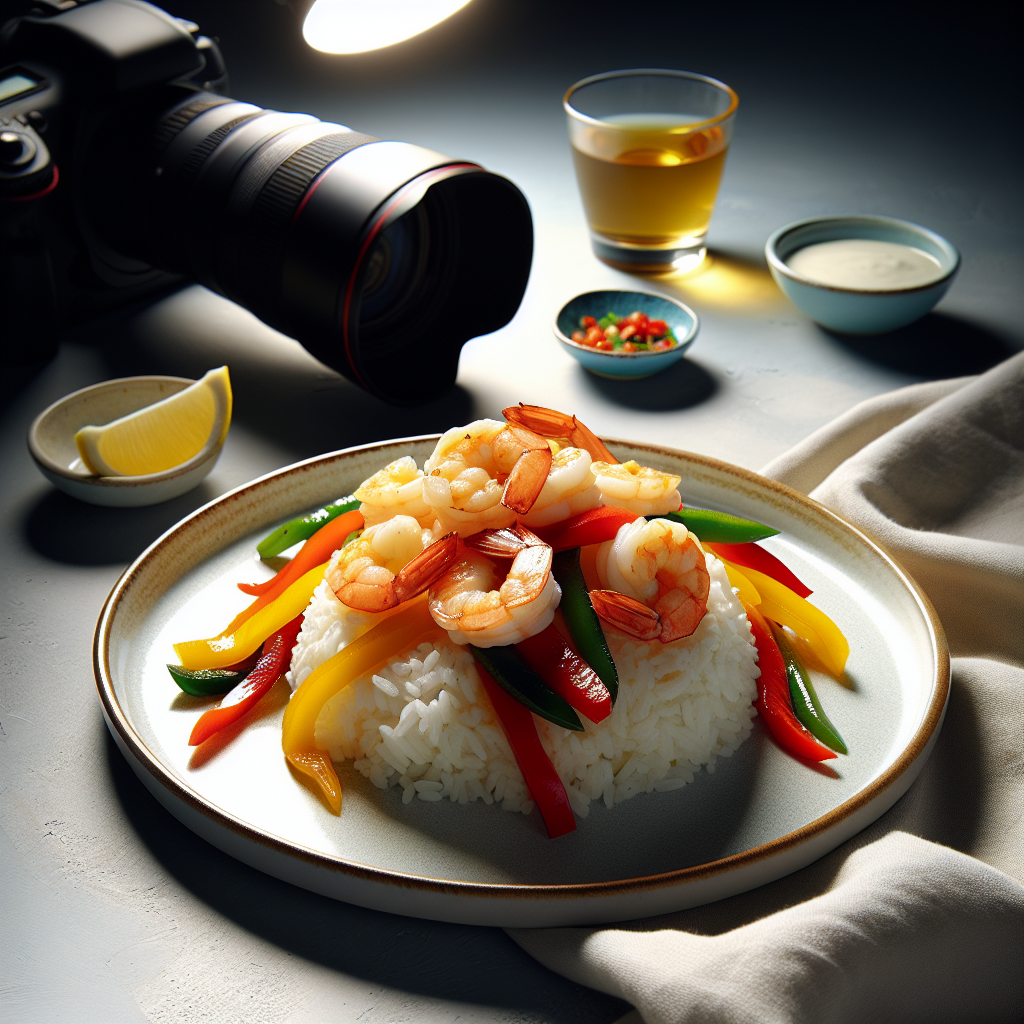 Brief Description: A colorful and flavorful pescatarian stir-fry dish with shrimp, bell peppers, and rice, perfect for a quick and delicious meal.