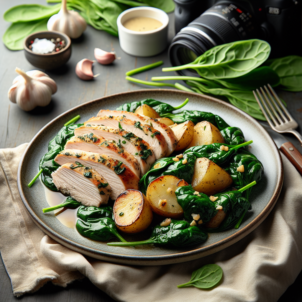 Brief Description: This flavorful and wholesome meal features tender turkey seasoned with garlic and herbs, accompanied by crispy roasted potatoes and vibrant sautéed spinach. Perfect for a simple and satisfying dinner.