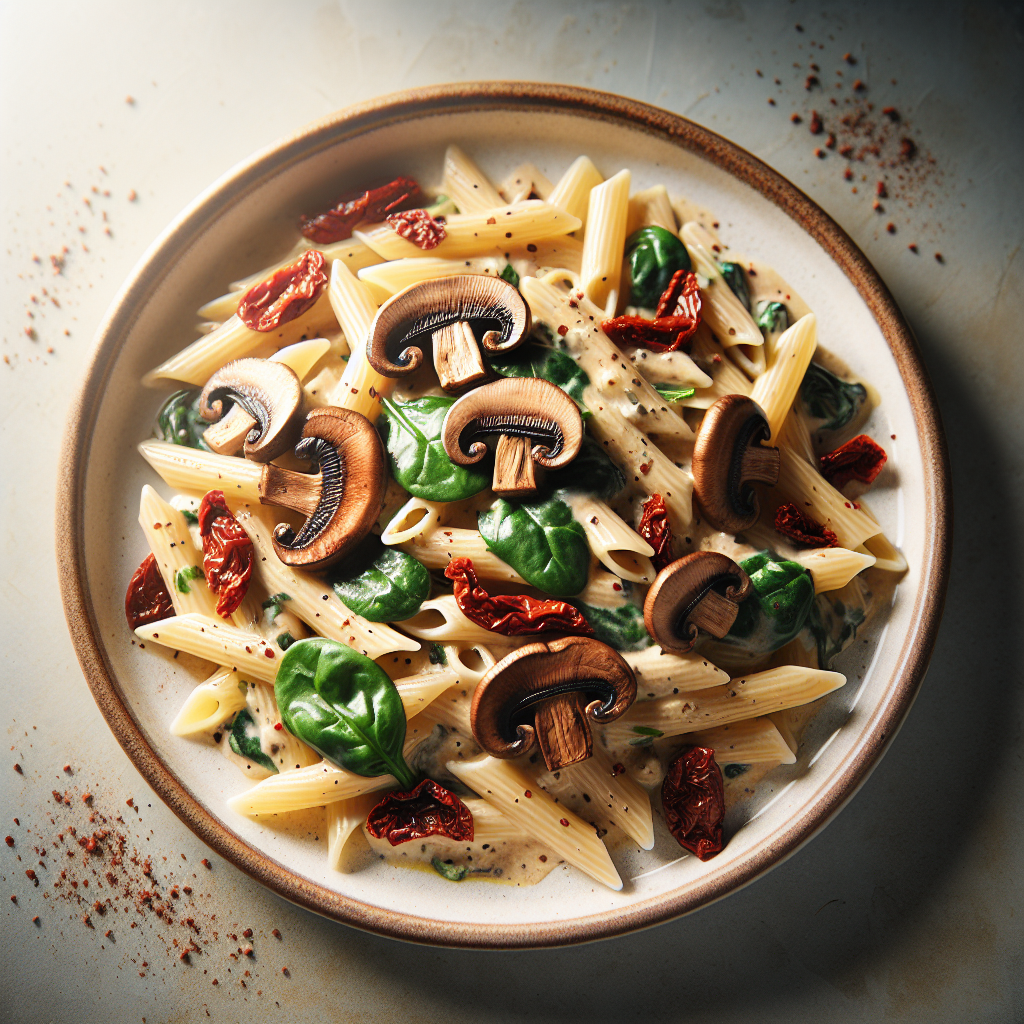 Recipe Title: Creamy Mushroom Pasta with Sun-Dried Tomatoes and Spinach