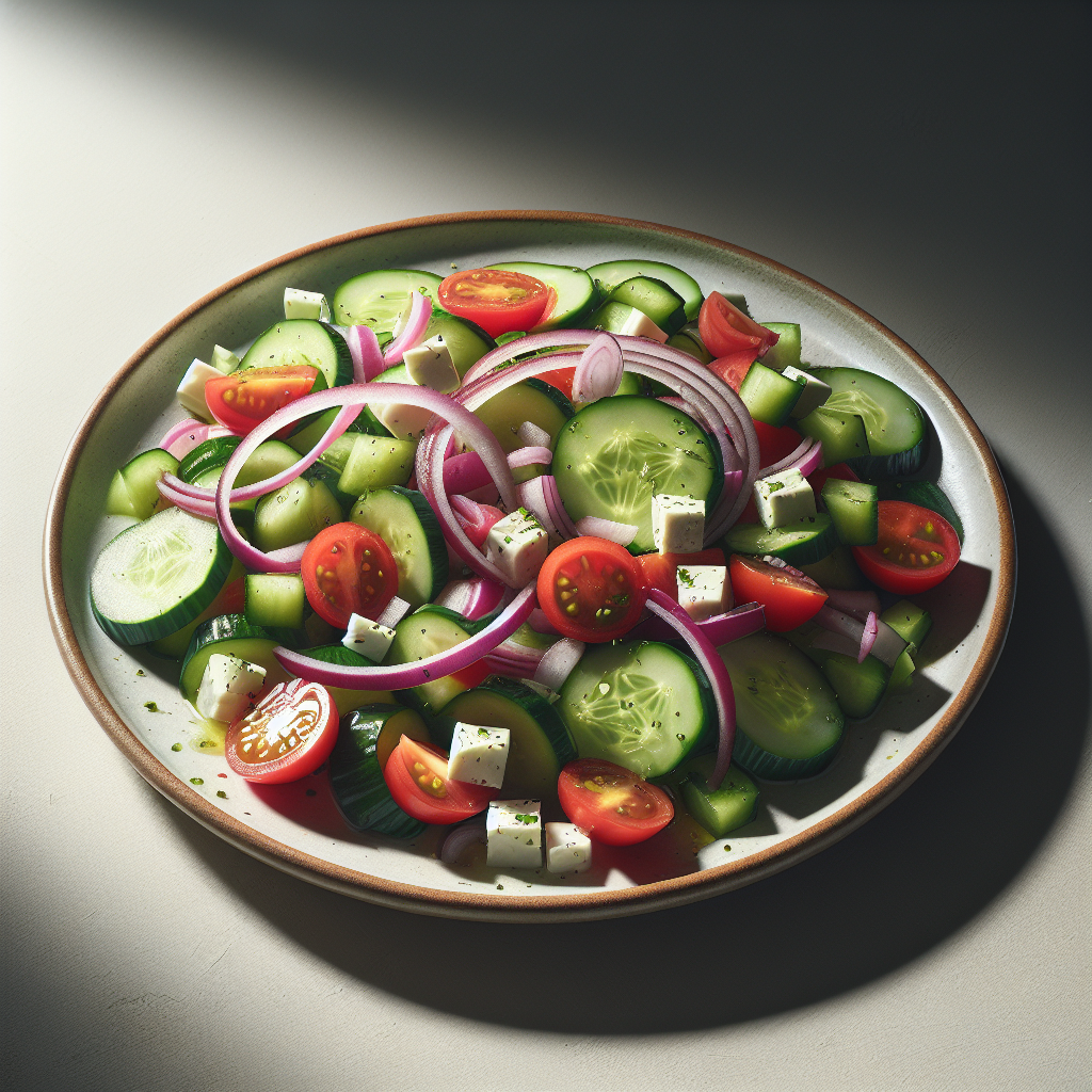 Brief Description: This Greek salad is a refreshing and flavorful mix of cucumbers, tomatoes, olives, and feta cheese tossed in a simple vinaigrette dressing. It's a perfect side dish for any meal or a light lunch on its own.