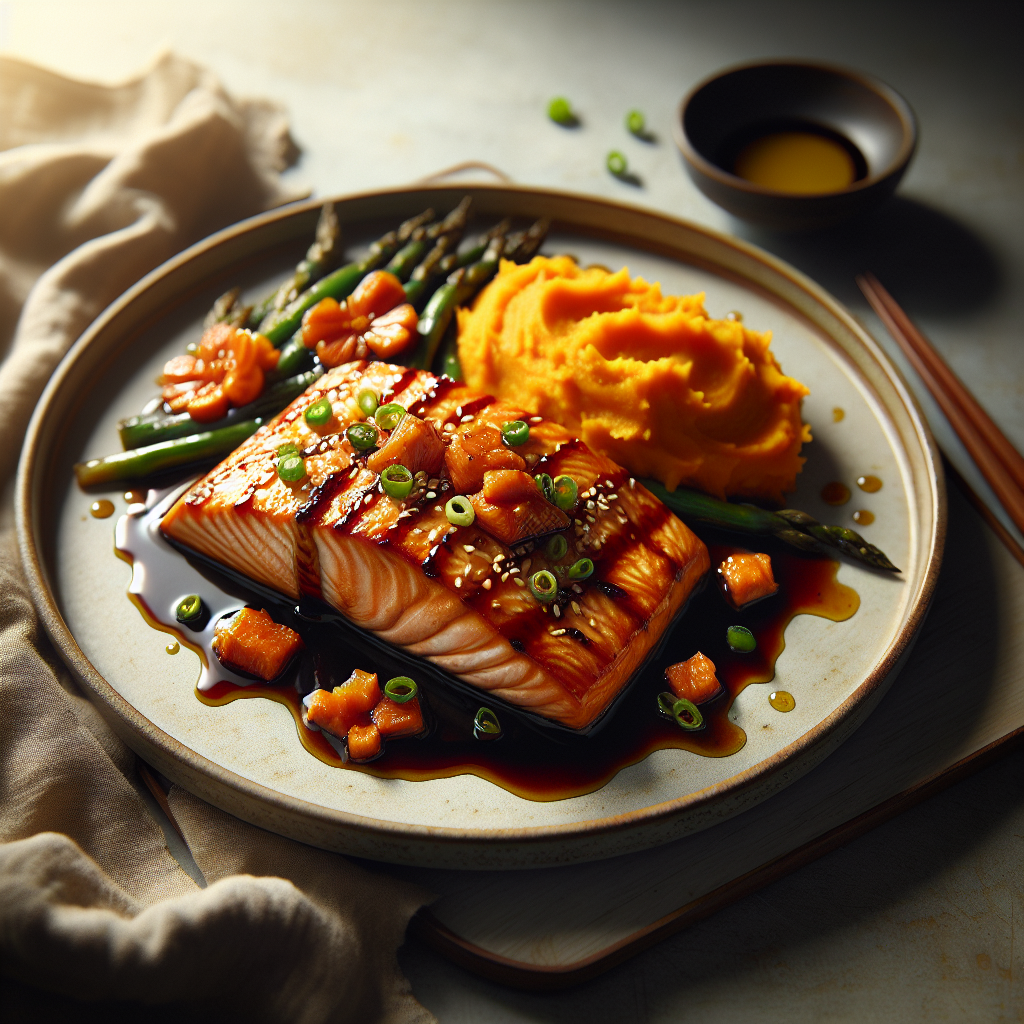 Brief Description: This recipe combines the delicate flavors of honey soy glazed salmon with creamy sweet potato mash, creating a nutritious and satisfying meal.