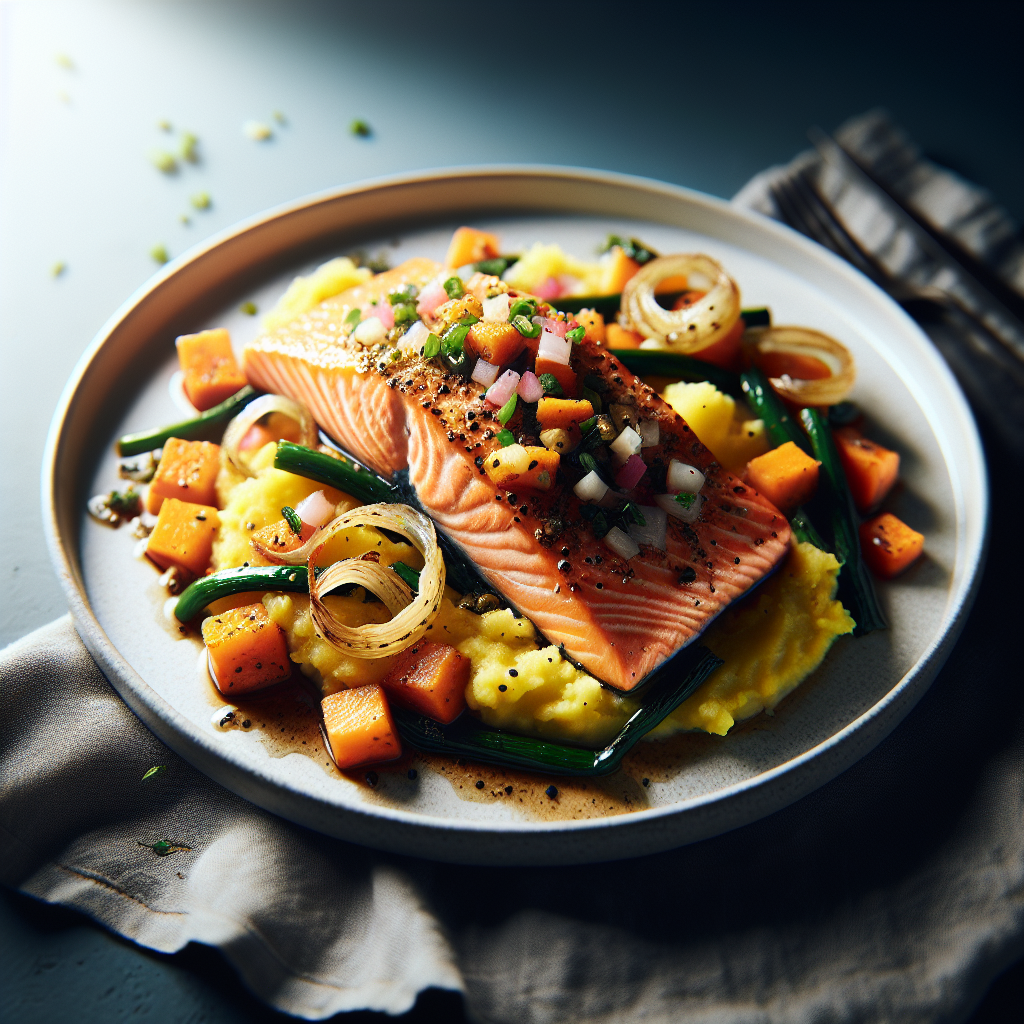 Brief Description: This recipe combines flaky baked salmon with a creamy root vegetable mash for a delicious and nutritious meal.