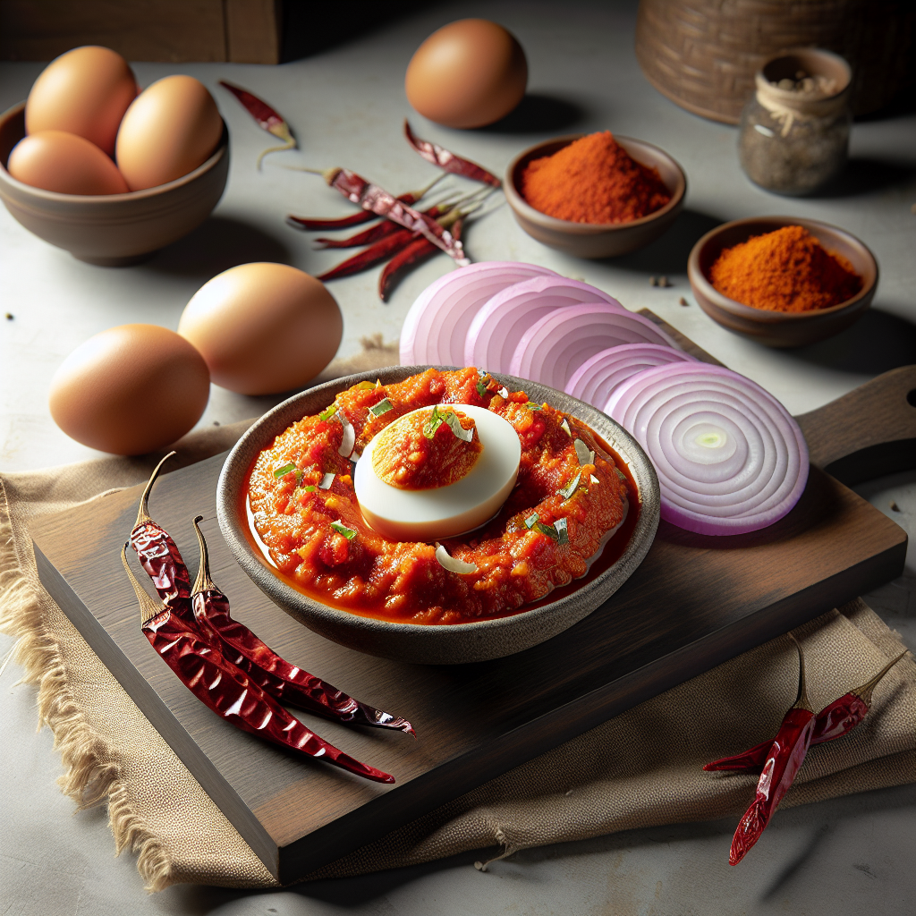 Brief Description: This flavorful Indian dish combines boiled eggs with a spicy and aromatic tomato-onion gravy, perfect for a satisfying vegetarian main course.