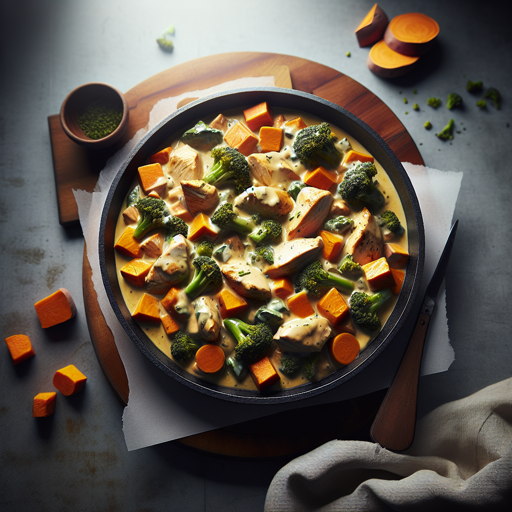 Brief Description: This gluten-free and low-carb main course is a delicious and comforting one-pan meal that combines tender chicken, sweet potatoes, and broccoli in a creamy cream cheese sauce.