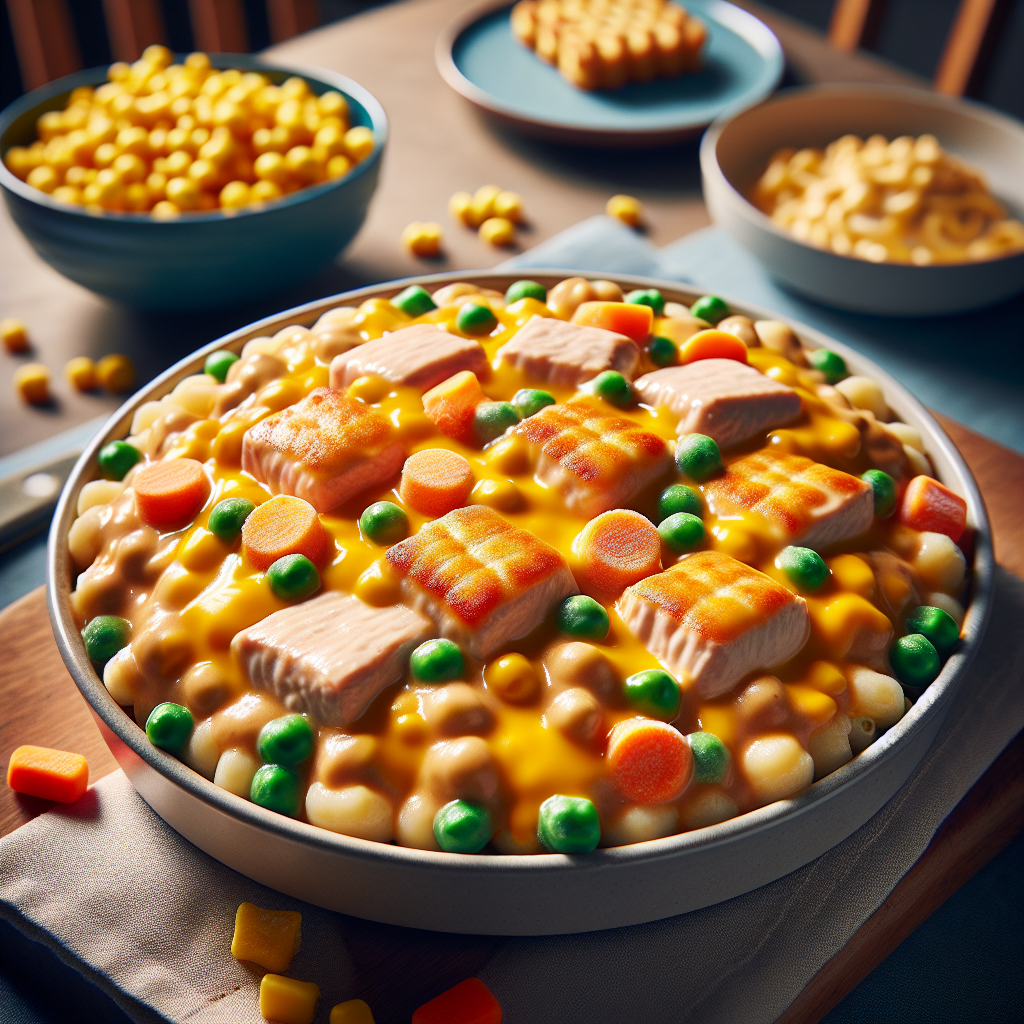 Brief Description: This high-protein American-style dish combines tender chicken, carrots, peas, and cheese with a classic Hamburger Helper twist.