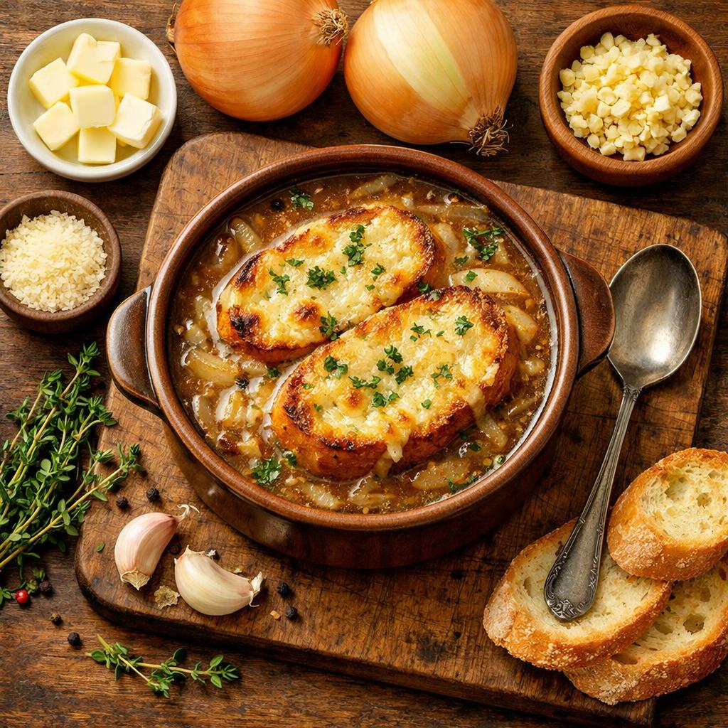 Brief Description: A classic French soup made with caramelized onions, beef broth, and topped with melted cheese and crusty bread.