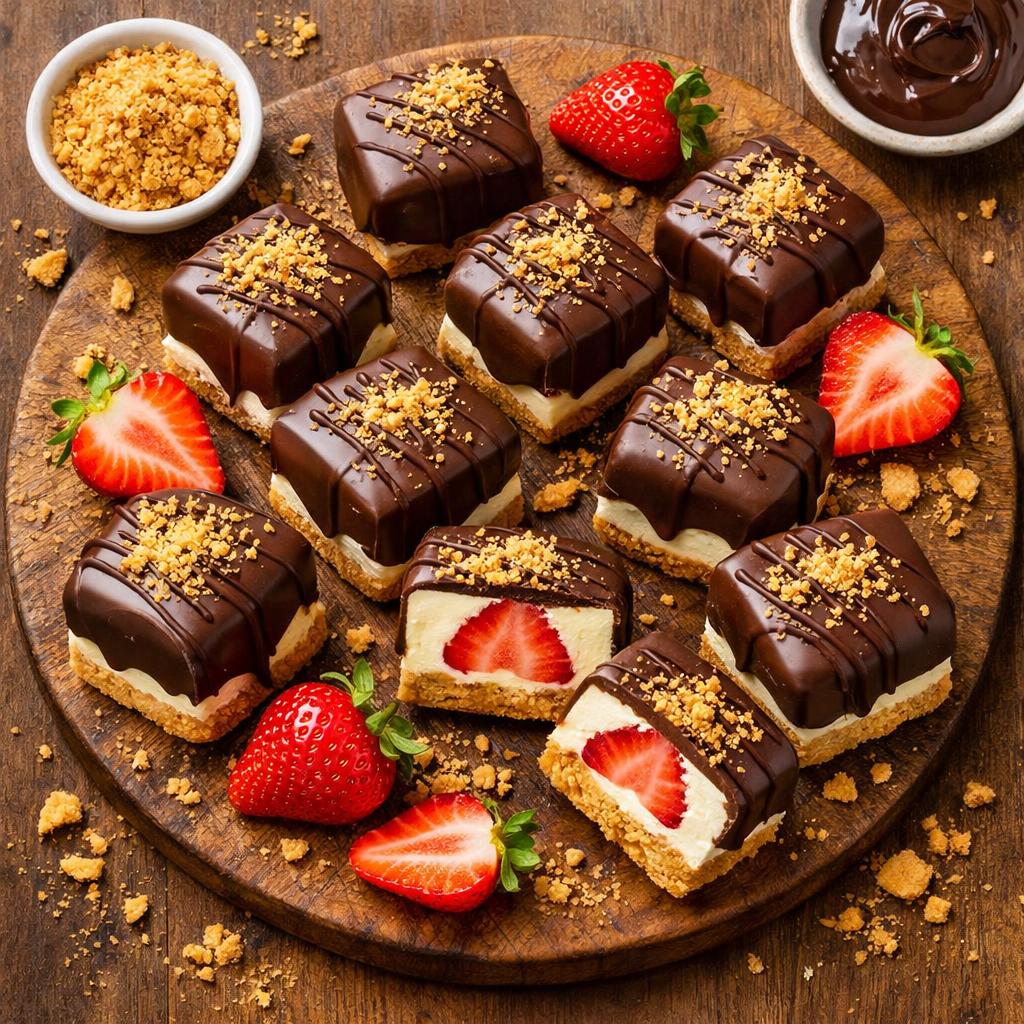 Brief Description: These decadent cheesecake bites combine the flavors of creamy cheesecake, sweet strawberries, and rich chocolate for a delightful treat.