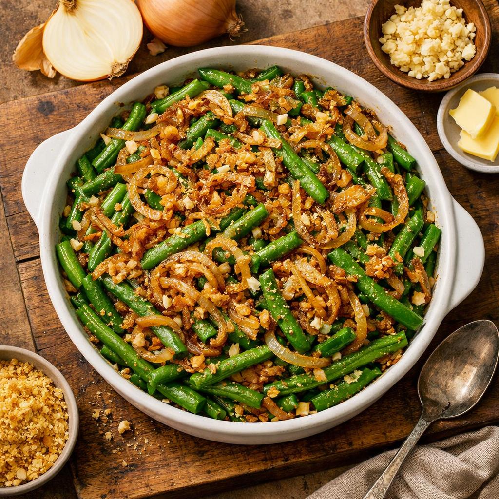 7. In a large mixing bowl, combine the blanched green beans, caramelized onions and garlic, and the cheese sauce. Mix well to coat the green beans evenly.